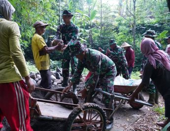 Aksi bersih bersih lingkungan di wilayah Koramil 07-11/Cibadak ini, dalam rangkaian kegiatan program TMMD ke-119 Kodim 0607/Kota Sukabumi.