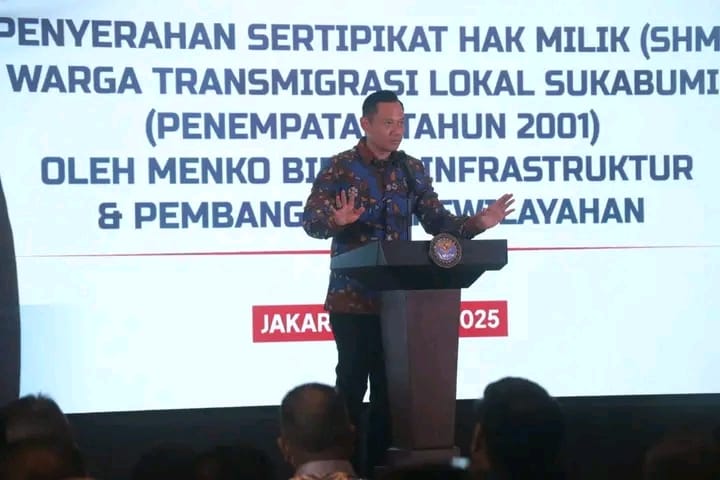 WARTAPOLRI.COM,SUKABUMI-Bupati Sukabumi H. Asep Japar mendampingi Menko Bidang Infrastruktur dan Pembangunan Kewilayahan H. Agus Harimurti Yudhoyono menyerahkan sertipikat hak milik (SHM) terhadap warga transmigrasi lokal Kabupaten Sukabumi di Gedung Makarti Muktitama Kantor Kementerian Transmigrasi Jakarta, Rabu, 18 Juni 2025. Penyerahan SHM tersebut sekaligus peluncuran program Trans Tuntas oleh Kementerian Transmigrasi.