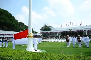 Prosesi berlanjut dengan mengheningkan cipta, pembacaan doa, dan pengibaran bendera Merah Putih oleh Pasukan Pengibar Bendera Pusaka (Paskibraka) Tim “Indonesia Berdaulat.”