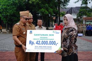 WARTAPOLRI.COM, GARUT- Bupati Garut, Abdusy Syakur Amin, menyerahkan secara simbolis kepada 6 ahli waris peserta Jaminan Sosial Ketenagakerjaan Dana Bagi Hasil Cukai Hasil Tembakau (DBHCHT) Kabupaten Garut yang berlangsung dalam apel gabungan di Lapangan Sekretariat Daerah (Setda), Jalan Pembangunan, Kecamatan Tarogong Kidul, Senin (8/9/2025).